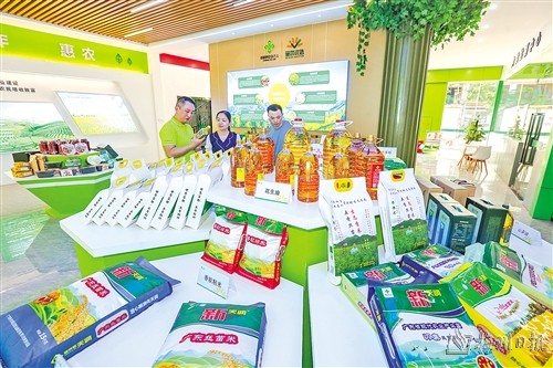 走进丰顺县供销社助农服务综合平台乡村振兴丰顺馆,记者看到八乡山红薯、留隍青榄、潭江茶叶、黄金姜糖……来自丰顺县16个乡镇的优质特色农产品在此展销,一镇多品,琳琅满目。“乡村振兴丰顺馆设立了16个乡镇约50个品种的优质特色农产品展示专区,一头连着各乡镇的山货好物,一头连着广阔消费市场,带动全县优质农特产品‘出山入湾’。”丰顺县供销社助农服务综合平台负责人黄龙介绍说。
