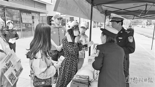 本报讯 (记者陈坚平)安全头盔和安全带是驾乘人员出行中最基本的防护措施,近日,梅州市公安局交警支队与梅江区江南街道鸿都社区居委会在新中路共同开展“安全带、安全头盔守护生命”文明交通志愿服务活动。