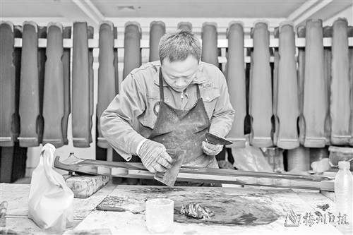3月25日,村民在徐场村一处民族乐器家庭作坊里制作古琴。