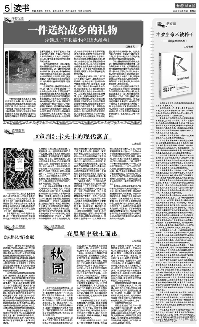 卡夫卡作品中的梦魇世界,是沉闷时代别具一格的写照,不仅是指作者生活的那个时代,也可以理解为是我们这个时代。《审判》中暴露的一些现象,在当代社会依然存在:令人窒息的官僚制度、荒谬绝伦的司法系统……约瑟夫·k所在的国家,拥有正式宪法,其他各种法律也十分健全,但这些宪法和法律却不能保护约瑟夫·k这样无辜的公民。本应起到保护作用的法律,却无缘无故地杀死了一个守法公民,这是怎样黑暗的社会?约瑟夫·k一直想努力挣脱法网、为自己洗清冤屈,但他面对的是整个庞大的法律机构,个体力量是无力与之抗衡的:“毫无疑问的是,在法院采取的这一系列行动——我指的是法院在处理我的案子中所采取的逮捕我和今天审讯我的这一系列行动——的后面,有一个庞大的机构在活动着。这个机构不仅雇用受贿的看守、愚蠢的检察官和其最大优点便是明白自己不中用的预审法官,而且还拥有一批高级的甚至是最高级的法官,这些人还有大量不可缺少的听差、办事员、警察和其他助手,或许还有刽子手呢……”在那个国家,一个公民随随便便地就有可能变成罪犯,就如律师所说的那样:“一个人的定罪,往往出乎意料地取决于随便哪个人偶尔讲过的一句话。”法官们都是一些什么样的货色呢?约瑟夫·k在法院办公室翻看法官们常看的一些书:“‘这儿所有的东西都很脏!’k摇着头说,那女人不得不用围裙拭去那些书上蒙着的厚厚一层灰尘。k伸手去翻看,他打开第一本,就发现一幅不堪入目的画。一男一女光着身子坐在沙发上,画家的淫秽意图十分明显,不过他的画技拙劣,画面上只有两个僵硬呆板的人直挺挺地坐在那儿,别的什么也没有……‘这儿研读的法律书便是这些玩意儿,’k说,‘受命审判我的便是这些人。’”约瑟夫·k努力想洗清自己的罪名,但法院的一个门房告诉他说:“不过,按照一般规则,我们的案子全是事先就判好了的。”在小说的结尾,一个教士讲述了一个意味深长的故事:一个守门人在法院门前站岗,一个乡下人走到守门人跟前,说他要求见法官。守门人让他等一等,于是他就等啊等的,但他一直也没能进去。几年以后,守门人告诉他说:“除了你以外,谁也不能得到允许,走进这道门,因为这道门是专为你而开的。现在我要去把它关上了。”