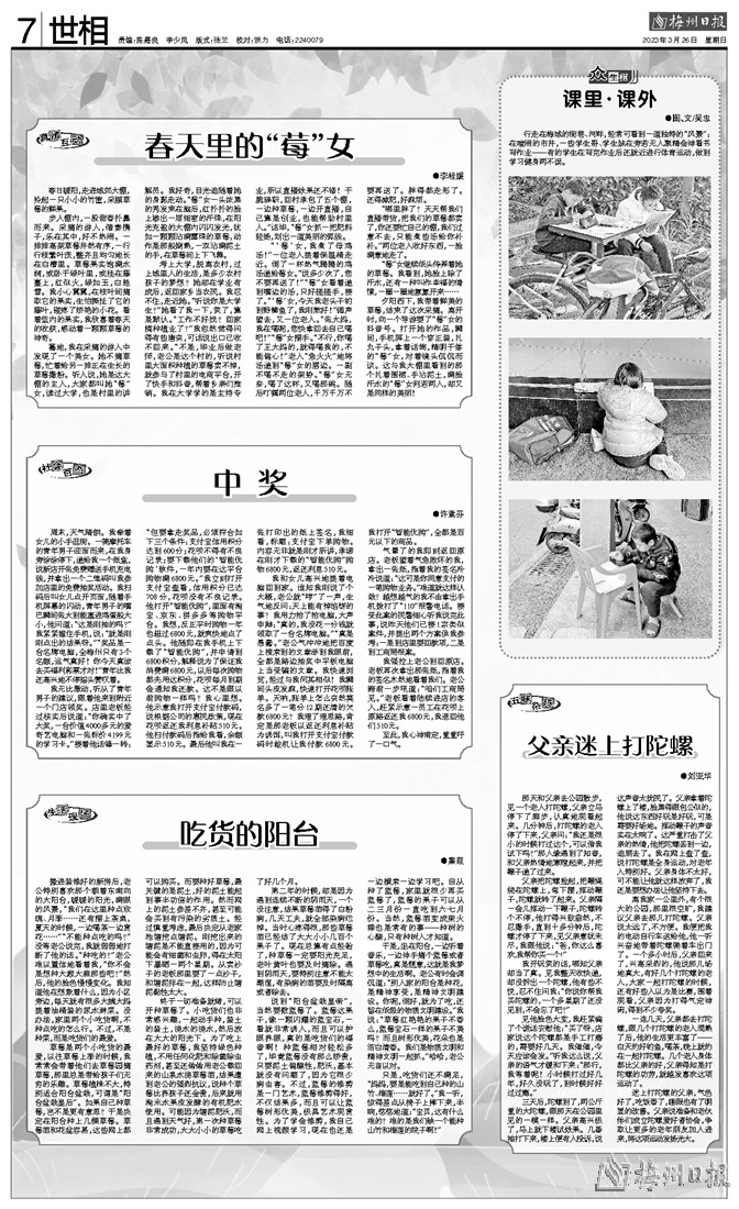 周末,天气晴朗。我牵着女儿的小手逛街。一骑摩托车的青年男子迎面而来,在我身旁徐徐停下,递给我一个纸盒,说新店开张免费赠送手机充电线,并拿出一个二维码叫我参加店里的免费抽奖活动。我扫码后叫女儿点开页面,随着手机屏幕的闪动,青年男子的嘴巴瞬间张大到能塞进鸡蛋般大小,他问道:“这是刚抽的吗?”我紧紧握住手机,说:“就是刚刚点出的结果呀。”“奖品是一台名牌电脑,全梅州只有3个名额,运气真好!你今天真该去买福利彩票才对!”青年比我还高兴地不停摇头赞叹着。