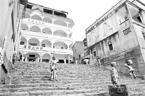 松江大酒店对面是火船码头,这是无数海外游子记忆的起点,思家念亲的起点。在码头的老台阶上,矗立着一些雕像,这些雕像的形状有些是游子手提行李即将远去,有些是孩子和女人在向自己的家人道别……它们都在无声地诉说着,当年发生在码头上的那一幕幕悲欢离合的故事。