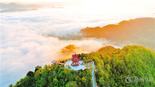 行至山腰,只见香火缭绕,为山峰笼上一层神秘的面纱。驻足山巅,青绿尽收眼底,让人仿佛置身其中,跑向灿烂的春天,舞动春的乾坤。若遇上好天气,于山顶观景亭处还可一览云海缥缈,云雾似从足底升起,曙日初照,浮光跃金,瑰丽不可方物。置身其间者,在慨叹茫茫云海翻滚之余,一路登高带来的疲惫早已消散。