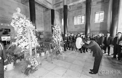 3月28日上午,中国国民党前主席马英九一行拜谒南京中山陵。这是在中山陵祭堂,马英九向孙中山坐像敬献花环。(新华社发)