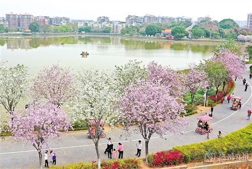 在梅城剑英公园内,洋紫荆树开出了粉色、白色、淡紫的小花,一簇簇、一团团,花姿优雅,色彩绚丽,吸引市民纷至沓来观赏。微风拂来,满树的花儿,像一只只飞舞的蝴蝶,别具风韵,人们纷纷掏出手机、拿起相机,留住这浪漫的美景。在绿轴花园广场,缀满枝头的花儿、随风摇曳的格桑花与湛蓝的天空交相辉映、相得益彰,空气中弥漫着淡淡的花香与泥土的芬芳,市民们或是在跑步健身,或是闲逛观景,好不惬意。
