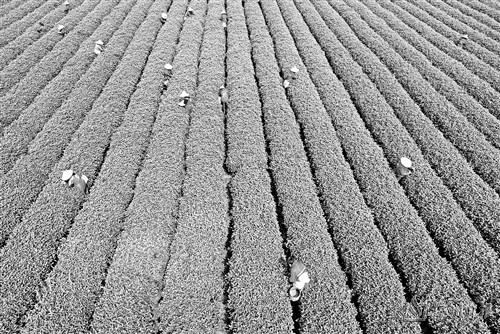 3月28日,采茶工在浙江省杭州市西湖区西湖龙井原产地一级保护区的茶园里采摘西湖龙井明前茶(无人机照片)。