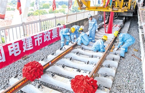 雅万高铁全线轨道铺通仪式3月31日在印度尼西亚首都雅加达举行,这标志着雅万高铁全线铺轨完成,为高质量开通运营奠定了坚实基础。(新华社发)