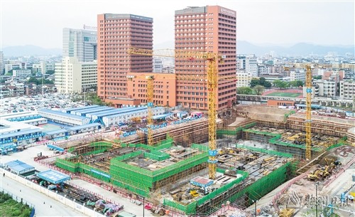 走进梅州市医学科学院大楼工程项目建设现场,塔吊动臂“挥舞”、机器轰鸣“奏乐”,敲打声、吆喝声此起彼伏,大干快上的场面十分壮观(如右图,林翔 摄)。这个总建筑面积达10.6万平方米的省市重点建设项目,正迈上主体结构施工的“快车道”,每天都有新变化、新进展。