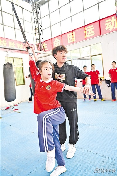 走在校道上,迎面走来的孩子们大都颔首礼貌地向记者一行问好。校园虽不大,但树阴成排,文化氛围浓郁,各项活动井然有序。该校音乐室、美术室、电教室、心理室等,以及各种球场,一应俱全,与普通一贯制学校不同的是,多了一间宽敞的武术训练厅。在训练厅,拳击对打的学生在台上训练,而耍枪弄棒的同学则在台下练习。只见无论男女同学,大家都极其投入,眉心夹着一股正气,每一个动作都那么刚劲有力。在教练的指导下,他们手中的长枪短棒或刀与剑,挥洒自如,看得围观者眼花缭乱。