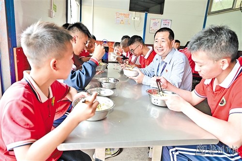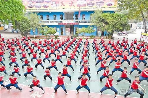 据该校校长苗德威介绍,学校聘请了7位武术教练,他们来自全国各地。在教学方面,学校教学目标与其他九年一贯制学校无异,只是每天早上和傍晚放学后多了一项武术课程,每天约3小时,周末两天也安排有专门训练,一周武术课程总时长超过20小时。“武术可以强健体魄,有助于孩子们每天精神饱满地学习。在这里,患感冒的孩子比较少。”说起孩子,苗德威透露,这20年来,他一直与孩子们同吃同住,常年住在学校;为确保饮食安全,每天亲自采购食材,与孩子们同在饭堂用餐,及时了解他们的需求。苗德威说,来这里的孩子都很独立,学习和生活都能较好地照顾自己。