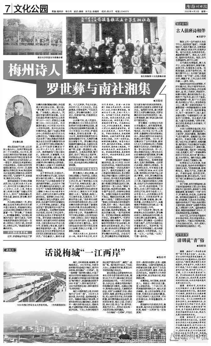 作为南社湘集的一员,罗世彝过去在有关南社研究的文献中甚少被涉及,郑逸梅的《南社丛谈》在《南社湘集姓氏录》只有寥寥一句:“罗世彝,广东梅县人,有《螺盦遗稿》。”在《南社湘集的内容》一章中又提及:“诗录有梅县罗季威的《哀弦曲》一百韵、《西征》二百四十韵,洋洋洒洒,为特长之作。”季威即是罗世彝的别字。