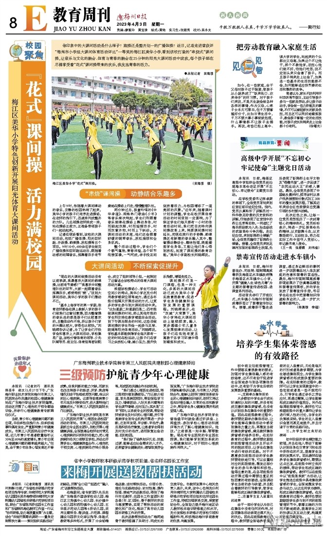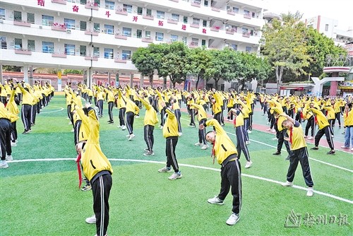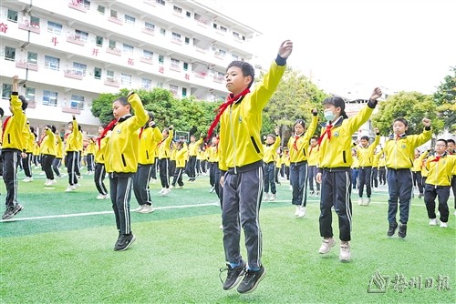 你印象中的大课间活动是什么样子?跑操还是整齐划一的广播体操?近日,记者走进曾获评“梅州市小学组大课间体育活动评比”一等奖的梅江区美华小学,看到该校打造的“串烧式”课间操,让音乐与文化的融合、体育与青春的融合在25分钟的阳光大课间活动中绽放,每个孩子都在尽情享受着“花式”课间操带来的欢乐,焕发出青春的活力。