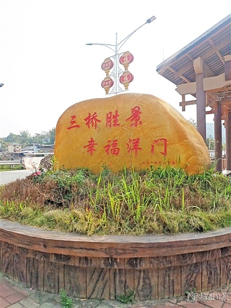 车子首先停靠在石马镇洋门村,走下车,我们向四处张望,只见一块巨石上写着鲜红的行书“三桥胜景,幸福洋门”。前边有锦绣廊和前程廊。据张副镇长介绍,锦绣廊是为石马衣锦还乡、光宗耀祖的乡贤返回的廊道,前程廊是学子奔赴前程走出去的廊道。右下方是一条石马河贯穿洋门村东西两岸,只见石马河水清澈透亮,荡起的涟漪在明媚的春光下熠熠生辉,向远处望去,河两岸的围栏像两排整齐划一的士兵在守卫着石马河。