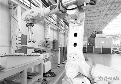 4月4日,技术人员在秦皇岛市山海关区中铁山桥集团有限公司高速道岔垫板生产线上调试机器人。
