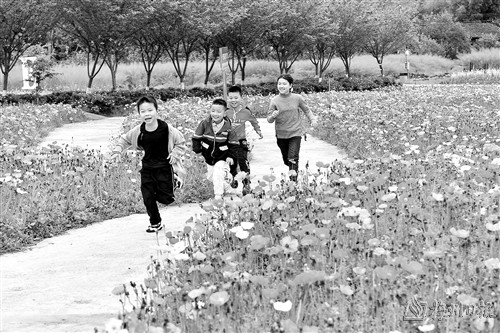 4月5日,游人在四川省广安市岳池县银城花海踏青游玩。