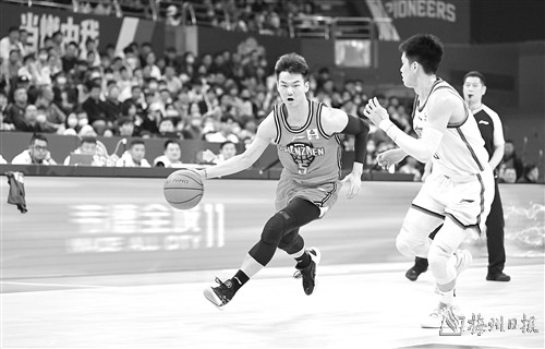 图为深圳马可波罗队球员孙浩钦(左)在对阵天津的比赛中运球突破。