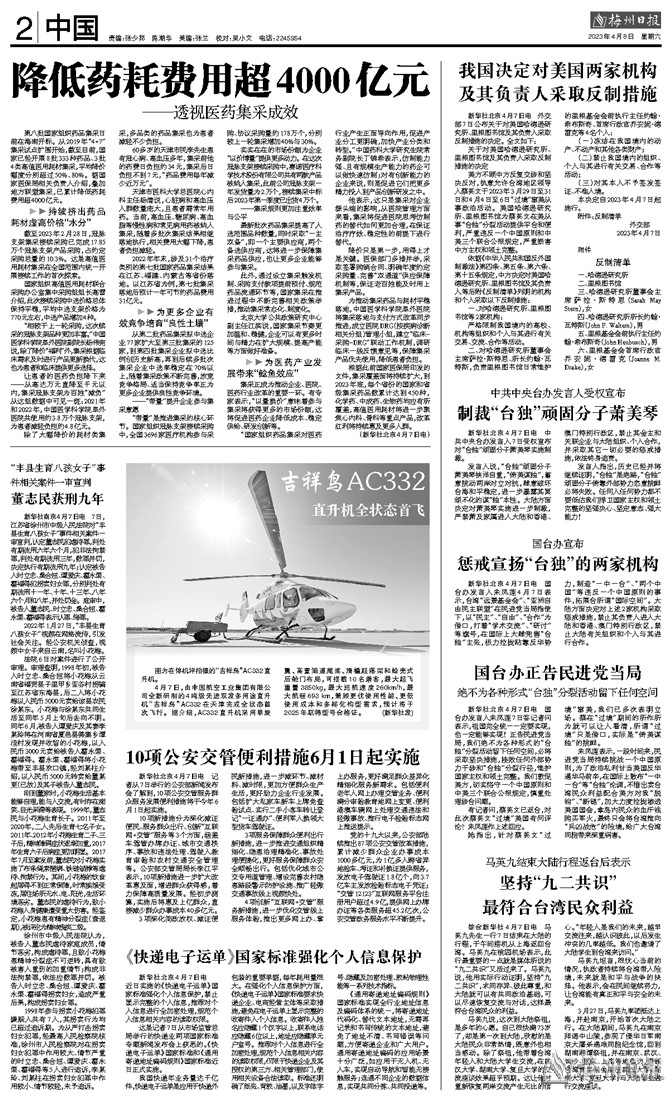 4月7日,由中国航空工业集团有限公司全新研制的4吨级先进双发多用途直升机“吉祥鸟”AC332在天津完成全状态首次飞行。据介绍,AC332直升机采用单旋翼、高置涵道尾桨、滑橇起落架和蛤壳式后舱门布局,可搭载10名乘客,最大起飞重量3850kg,最大巡航速度260km/h,最大航程693 km,兼顾更优使用性能、更低使用成本和多样化构型需求,预计将于2025年取得型号合格证。 (新华社发)
