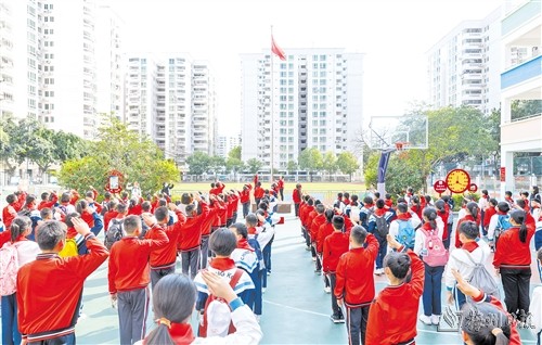 伴随着一阵阵欢迎的掌声,客都小学学生代表为远道而来的香港青少年学生佩戴红领巾。随后,客都小学的护旗手们手托国旗,迈着铿锵有力的步伐,向着升旗台行进。当《义勇军进行曲》旋律响起,香港、梅州两地的青少年学生全体肃立,目光紧紧跟随缓缓上升的五星红旗,深怀对祖国无限的热爱和崇高的敬意,向国旗敬礼(如右图,林翔摄)。“我们学校也有升国旗,但在这里感觉特别不一样。”香港正觉莲社佛教正觉联社学校六年级学生张杨告诉记者,梅州是他好朋友的故乡,在此之前他就对梅州有一些了解,现在非常期待这趟旅程。