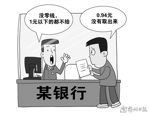 4月5日,河南马先生吐槽称,自己在银行取款0.94元无法取出,工作人员称不足1元,没有零钱,因此被“抹掉”。银行工作人员称:“九毛四没零钱,成毛的都没有一块钱,一块钱以下的都不给。”马先生反驳:“假如我来存钱的话,我少你九毛钱你愿意不愿意?” 朱慧卿/图