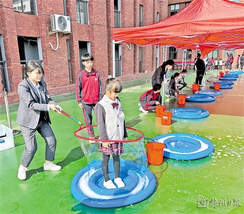 除了精彩的表演,学校还在操场的空地上设置了别具一格的科学“体验区”。记者看到,每个年级都有相应的科学体验区域,让不同年级的学生们都能参与其中,感受科技的乐趣。“真是太有趣了!”在一片空地上,该校一年级的学生们正在体验“泡泡秀”。只见一位学生站在泡泡池中心,一旁的老师则手持泡泡圈,沾上泡泡水后用力一挥,瞬间将这名学生整个人都罩在了巨大的泡泡中,让周围观看的学生不时发出“哇塞”的叫声。此外,还有“记忆合金体验”“人体导电球”“VR人体识别”“写字机器人”……据了解,梅州市外语实验学校在此次科技节共设置了50项互动体验小项目,让学生们亲身体验科技的魅力。