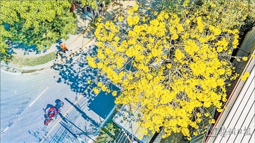 “三五朵花簇拥成花球,婀娜多姿。风一吹,摇下一地‘黄金’,十分好看。”在桂岭大道北邂逅了“一树黄花”的市民涂阿姨禁不住一片片“黄金甲”的“诱惑”,拿出手机与绮丽的黄花风铃合影留念。