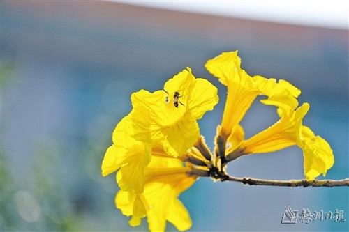据了解,黄花风铃木也称黄金风铃木、巴西风铃木、伊蓓树,原产于墨西哥及中美洲、南美洲,是一种会随着四季变化而更换风貌的树,春天枝多叶疏,3至4月开花,花期较短,约10-15天,花冠漏斗形,也像风铃状,花色鲜黄;夏天长叶结果荚;秋天枝叶繁盛,呈现出一派绿油油的景象;冬天枯枝落叶,显现凄凉之美。目前在蕉岭县实验中学、国道等地都能看到这“限定款”的金黄春色。