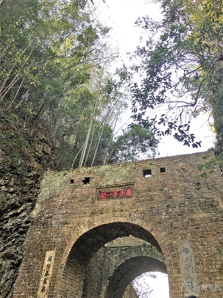 沐浴着阳光,我们终于到达了梅岭山顶,巍峨雄伟的关楼映入眼帘。这座始建于宋代的关楼耸立于梅岭的分水界上,同时也是赣粤两省的交界处,我们登上梅岭时正位于江西省,而过了这座关楼,就到了岭南的广东省,这种“一步跨两省”的乐趣颇为别致。