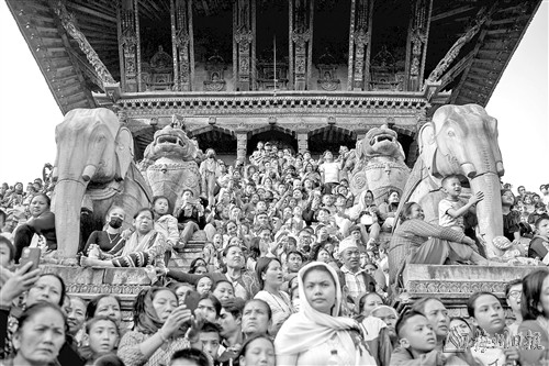 4月10日,人们聚集在尼泊尔中部加德满都谷地的巴克塔普尔观看传统的新年庆典。
