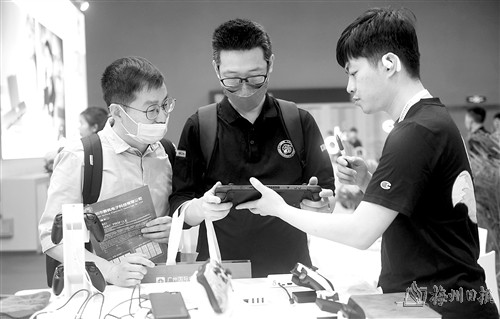 图为参观者在展会上参观选购电子产品。(新华社发)