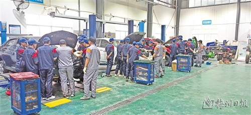 拆卸、测量、安装……走进大埔县田家炳高级职业学校(以下简称“田家炳职校”)汽车运用与维修专业的实训室,学生们正专心致志地拆解汽车发动机。“左手压扁一点点”“擀面是有技巧的,同学们看着老师的手法”,不远处的中餐烹饪实训室内,老师正在指导学生做中西面点,课堂气氛很是活跃……