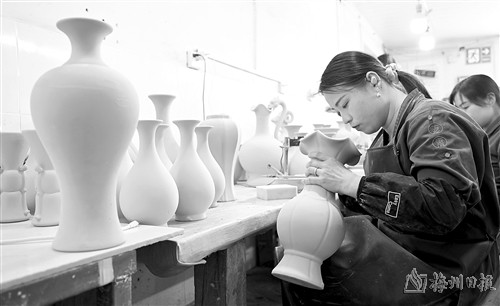 4月13日,在河南省汝州市一家汝瓷生产车间内,工人在进行汝瓷生产作业。