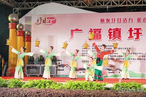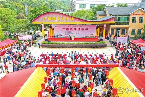 广福镇党委书记陈国政在致辞中介绍,广福镇位于蕉岭县北部,地处粤闽两省交界,与周边省市县地缘相近、文缘相通、人缘相亲,资源禀赋,边贸和交流畅通活跃,一直保持着赴圩传统,每逢农历的一、四、七是广福圩日。2019年5月18日在广福镇开启了“赴圩节”。在这里,不仅可以体验广福地道美食,采购本地农特产品,还可以品尝福建商人、农户运过来的美食,购买特色农产品和手工艺品,体验别样的边贸风情。