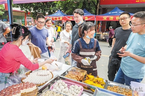 “老板,来一只油焗鸡!”“好的,55元一只。”广福镇好好好酒楼的摊位很是热闹,负责人黄祖强告诉记者,油焗鸡是广福特产之一,特点是表皮酥脆、肉质鲜嫩。他说:“我们制作油焗鸡已有20多年历史了,三天下来卖出近200只油焗鸡,销售量是平时的两倍。”广福豆干制作技艺是市级非遗代表性项目,项目传承人黄荣珍热情推介豆干,市民游客试吃后争先购买。“活动非常热闹,仅14日上午销售额就有1000多元,比起在家门口经营,圩日生意更好。”黄荣珍笑着说。