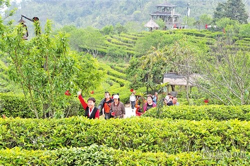 在梅州市韩山历史文化旅游区海拔千米以上的高山上,韩岽笼云,茶田拢翠,以茶兴旅,游人如织。近日,该旅游区被评定为国家4A级旅游景区。名人名茶园里集萃中华茶经、茶道、茶景、茶俗、茶史和茶种于一体,以“群贤论道,云海茶园”的设计理念,以多元化的茶文化表达,传承、弘扬中国茶文化。在此处可观云海奇石变幻万千,看岩石雕刻的茶诗、茶道,坐亭中品茶香茶韵绵延。每逢假日,慕名而来的游客络绎不绝,体验采茶乐趣、踏青避暑。他们乐于在这里泡上一壶新出的春茶,惬意地享受假日。