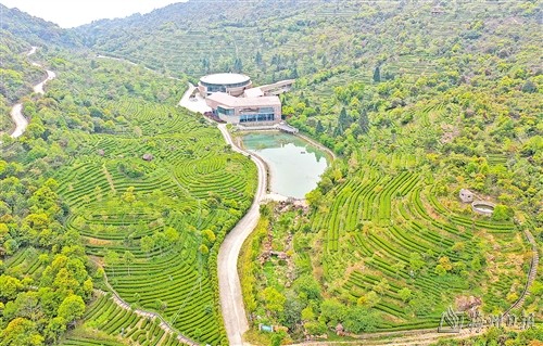从茶山鸟瞰,造型如茶具的韩山茶博馆就坐落在千亩茶园间,建筑内部设有古朴静雅的茶室以及茶文化工作室,可于此开展茶讲座和品茶活动。除了研学旅游,景区还通过举办特色采茶节等活动,弘扬茶文化,发展茶旅产业。