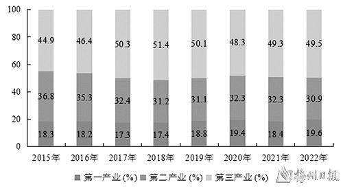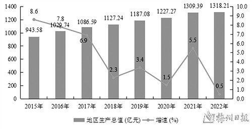 经广东省统计局统一核算,2022年梅州市实现地区生产总值(初步核算数)1318.21亿元,比上年增长0.5%。其中,第一产业增加值257.91亿元,增长4.7%;第二产业增加值407.69亿元,下降3.5%;第三产业增加值652.60亿元,增长1.3%。三次产业结构比重为19.6:30.9:49.5,第三产业比重提高0.2个百分点。人均地区生产总值34085元,增长0.6%。