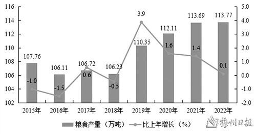 全年粮食产量113.77万吨,比上年增长0.1%,其中,稻谷产量105.72万吨,下降0.1%;甘蔗产量4.76万吨,下降6.6%;油料产量3.79万吨,增长2.4%;蔬菜产量259.23万吨,增长5.6%;水果产量160.90万吨,增长3.5%;茶叶产量 2.77万吨,增长8.3%。