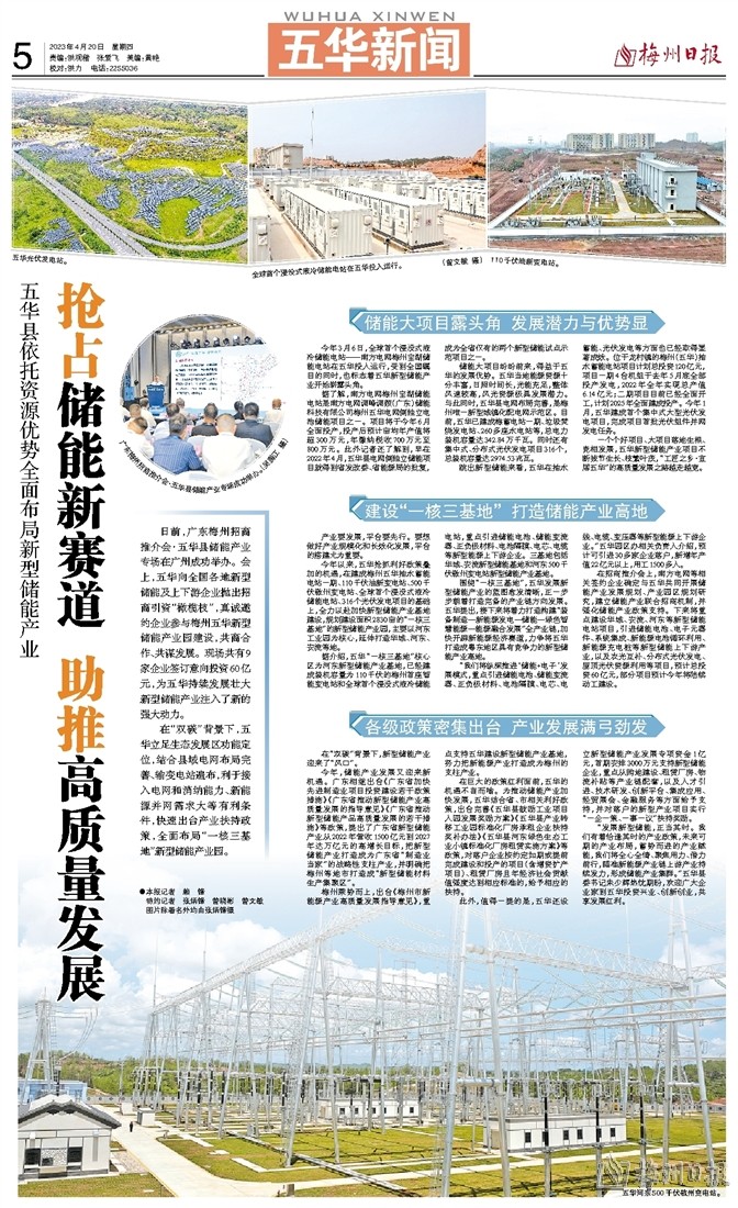 梅州乘势而上,出台《梅州市新能源产业高质量发展指导意见》,重点支持五华建设新型储能产业基地,努力把新能源产业打造成为梅州的支柱产业。