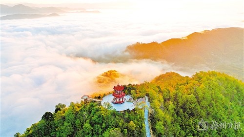 来到眺望台,耳边传来风声、鸟叫声、流水声,脚下的云雾时而飘动,时而变幻。远山都被云雾包裹得严严实实,略高的山峰有的崭露头角,有的微显山脉,形成了天空与云海的分界线。铜鼓峰和凤凰山争高,勾勒出一幅灵动的水墨画。在和谐亭的映衬下,我就像不小心闯进了南天门的猴子,沉浸在这美妙的自然画卷中。突然,一束强光打在摄影师的脸上,他眯眼看了看光源方向,迅速又低下头紧盯无人机遥控器上的屏幕,生怕错过每一个瞬间。我转身朝光源方向看去,红日缓缓冲出云海,被染红的云雾四处乱转,生怕挡住太阳的金光纷纷避让,金色的光芒投射在山头,水墨画般的风景瞬间被染上了色彩。金色的阳光透过云层,洒在我的身上,穿透了我的躯体。我感受到了一股强烈的能量,仿佛灵魂之门被撞开,心跳声喘息声此起彼伏,奏响一曲气势恢宏的人与自然的交响乐。