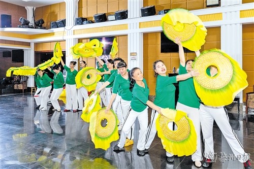 4月21日下午,梅江区文化馆综合大厅上演着一幕幕迎接丰收的美好场景:勤劳热情的妇女满怀喜悦,在柚园、茶园采摘,在田间嬉戏,并载歌载舞欢迎远道而来的客人……这是梅江区老干部大学舞蹈队在紧张排练。“我们有21位队员,平均年龄56岁。在老干部大学上课期间,每周三、周五固定练舞,所以大家都具备基本功。”队长赖小桃告诉记者,广场舞是群众性活动,非常有利于身心健康,让她们开心快乐、学到东西,在退休后找到生活的乐趣。