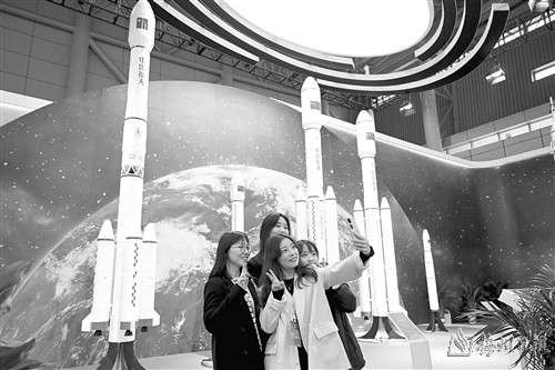 4月24日,观众在2023年“中国航天日”科普展览上合影留念。