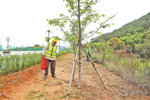 “植树坑要挖深一点,先把土踩实再浇水……”春天正是植树造林的好时节,在梅县区公路事务中心组织的东部快线第五标段(雁洋环镇路)植树活动现场,大家挥锹铲土,种下了一棵棵樱花树。“为把东部快线打造成樱花大道,我们去年底在率先通车的第五标段种植了近2000株樱花树,现在趁着春季补种一些。”梅县区公路事务中心计划工程部副部长宋健说。