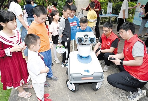 活动现场,一个大眼睛的机器人吸引了小朋友们驻足观看(如上图,钟小丰摄)。“这是一台智能巡检机器人,它能在变电站里自由运行。它的大眼睛能自动检测出变电站里电器发热故障,还能自动识别电站的各种仪表数据,并发送到控制室。”志愿者一边介绍,一边向小朋友们演示机器人的功能。
