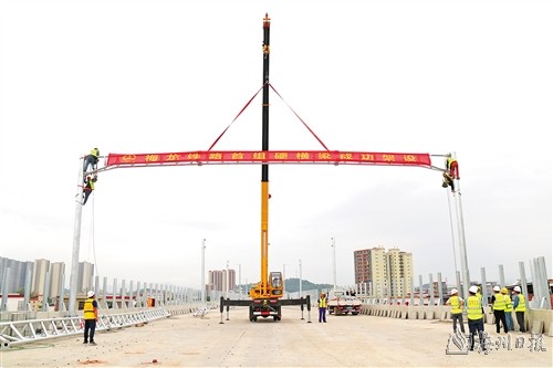 本报讯 (记者赖锋 通讯员樊元昊 刘媛媛 杜含蕊)4月21日上午9时,梅龙高铁项目首组硬横梁在五华站成功架设(如下图),标志着由中国中铁电气化局二公司参建的梅龙铁路接触网专业上部安装工程正式拉开序幕。