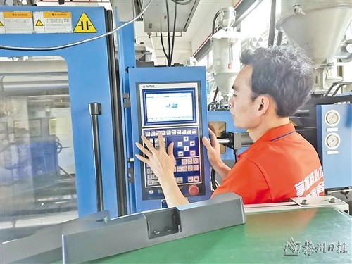 五一前夕,程华龙正在车间指导着徒弟如何辨别机器是否正常运作,“你看产出的产品表面光滑,颜色也很均匀,说明我们的机器是正常运转的。”程华龙边检查产品边讲述着产品表面留痕、尺寸不稳定、脱模困难等缺陷的原因。他告诉徒弟,如果注塑压力太高、保压时间太长、模温太高、模板变形都会导致脱模困难。出现产品异常,要先确定原因,才能有针对性地进行调试。不仅如此,他还提醒道,一定要认真查看每一个产出产品,遇到异常才能及时调整设备,以免增加不必要的成本。“师傅对工作很认真负责,技术也很好,不懂的他都会很耐心教。”程华龙的学徒何小清说,自己之所以能够上手快,离不开程华龙的耐心指导。
