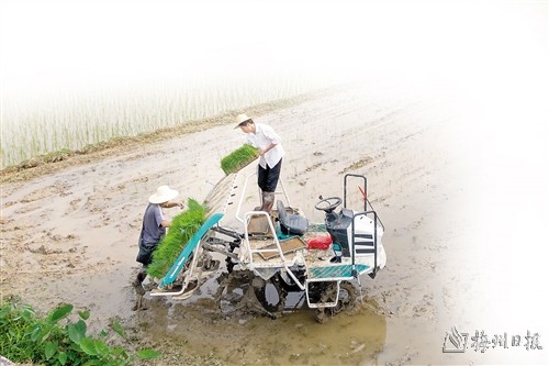 在枫朗镇大埔角村,梅州市合生源实业公司负责人罗少锋驾驶着插秧机在田地里缓缓前行。插秧机所过之处,秧苗整齐有序地插在田地里。