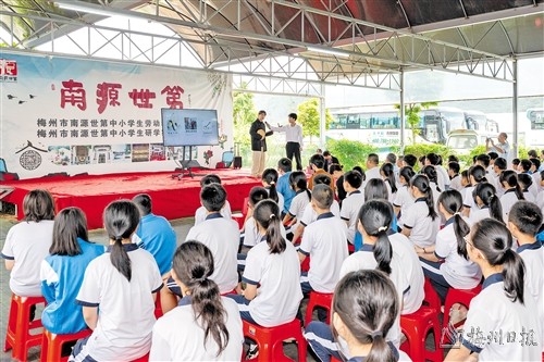 文与旅相伴,旅因文而兴。在南源世第素质教育营地,记者看到的又是另外一种沉浸式、互动式的文旅融合新业态。采访当日,来自梅县高级中学的250名初一学生正在营地里开展研学实践教育,在半天的时间里,学生们认真学唱客家山歌,欣赏杯花舞等客家传统非遗表演,动手野炊等劳动实践活动。据梅州南源世第文化产业发展有限公司运营经理古瑜金介绍,南源世第素质教育营地设计开发适用于小学、初中、高中不同学段的研学实践、劳动实践活动课程40门,客家文化+红色精品活动线路10条,课程内容包括客家文化、家风家训文化、客家非遗、民俗、建筑、人文、爱国教育等方面。仅2023年3月就接待了2000多名来自我市和周边地市的学生研学实践活动。