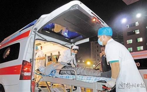 4月22日晚上7时55分,寂静的梅州市中医医院内,突然,一阵阵急促的鸣笛声传来,由远及近,伴随着红蓝交替闪烁的警示灯。