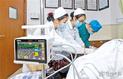 “这样的场景每天都在发生,不管白天黑夜。”梅州市中医医院急诊科主任钟裕权告诉记者,市120急救中心指派、外院转运加上患者自行来院,科室年急诊诊疗人数超5万人次,位居全市第二,年120出车量连续多年在全市首位。