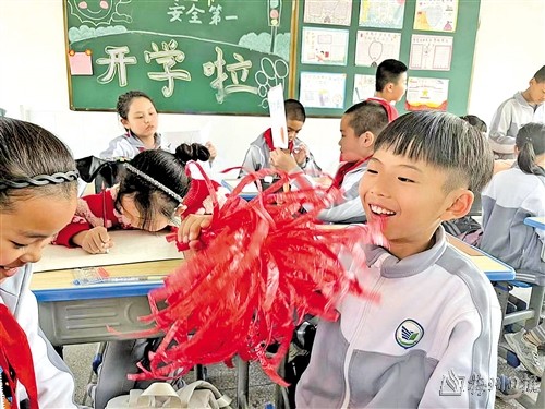 班际足球赛准备开赛了,在班主任的指导下,全班同学分工合作,有的在做加油助威牌,有的在做花球。图中是一位学生完成了自己的花球,高兴得合不拢嘴。